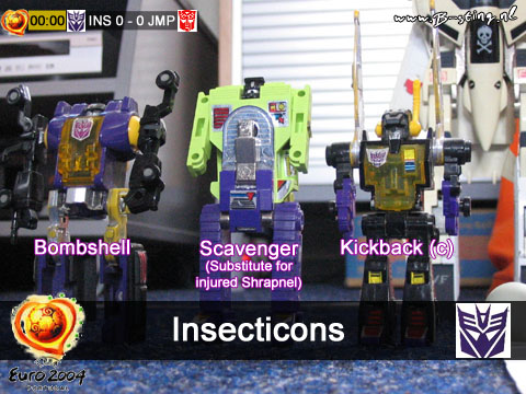 Today we'll be reviewing the altEuro2004 Insecticon vs. Jumpstarters and I'll be explaining you how off-side works and why having a bad tempered Insecticon is a nuisance in any team. ![]() First the Autobot Jumpstarter team with Topsin, the captain and goalie as well as the Twintwist twin-brothers. ![]() The Insecticon team, by exception, were allowed to substitute goalie Shrapnel who injured himself while eating a nova powercore in the previous match. His replacement was recruited from the Constructicon team: Scavenger. The team is completed by teamcaptain Kickback and Bombshell. ![]() The ref for this match will be Jetfire from a parallel universe. Some say he's a cheap immitation, hence the hostility from some of the audience. ![]() Straight from the kickoff the Insecticons are on the offensive. Kickback passes it to Bombshell but the Jumpstarter players object for offside! The ref awards the Jumpstarters a free kick because it was indeed offside! ![]() Let's see this again in the replay. This is the moment Kickback passes it to Bombshell. ![]() From a different angle we can clearly see it. The ball is passed to Bombshell when he is waaaay behind the other fieldplayers (goalie not included). This is not allowed since the attacking side always has to be behind the last opposing fieldplayer (seen here by an imagenary yellow line) or he can't be included in the game. This is to prevent from attackers lounging around the enemy's goal and waiting for the ball to be tossed to him. ![]() The Insecticons protest the ref's decision but he's strict and waves them off. Meanwhile Topspin is setting up the free kick. ![]() But what's this! While Kickback is walking back, Topspin passes it to Twintwist who makes a storm for the goal. Bombshell protests for offside but the ref keeps the game rolling. Kickback tries to run after Twintwist to stop him but ... OOOOH!! A fierce tackle by Kickback on Twintwists ankles! Surely this will not go down well with the ref! ![]() Was this offside? Let's see again. Nope! This time Kickback was the last player and Twintwist received the ball before he ran past Kickback! ![]() The ref pulls a card and it's ... RED! Kickback get's a red card! What a turn-about so early in the game! Bombshell again wants to protest to the ref, but Twintwist stops him. These guys gotta watch out or both of them might get sent off. ![]() Kickback leaves the pitch and shakes his head still disagreeing with the ref's decision. Meanwhile the ref points to the penalty dot, indicating it's a penalty. Twintwist was indeed tackled inside the penalty box. ![]() Can the constucticon stop this one? Twintwists backs up a little and ... ![]() .. HE SCOOOOORES!!!! Scavenger chose the wrong the wrong side! ![]() The Autobots celebrate with their leader and coach Optimus Prime. The stunned Decepticons just lie down on the pitch trying to comprehend how they can be 0-1 down in the 1st minute and they'll have to fill the next 89 minutes with one player less ... |